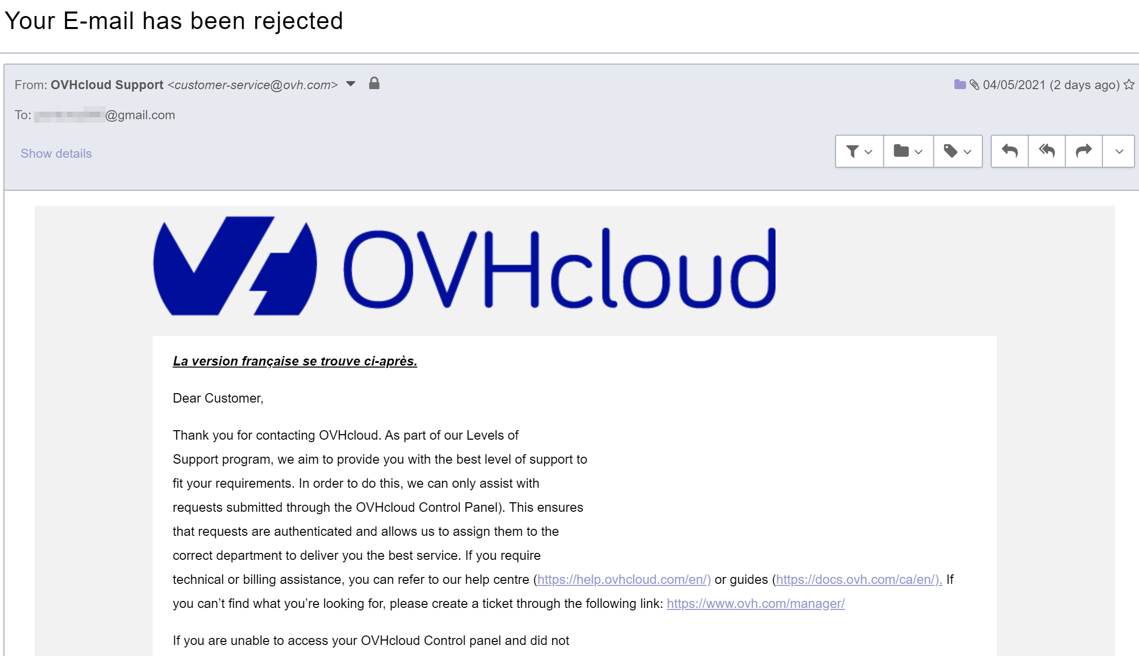 Do not use OVH services. If you do use OVH services, setup full regular backup (files, databases, etc) somewhere outside OVH infrastructure.